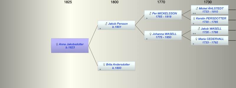 | 06 May 1823 | Anna Lisa Jakobsdotter was born | Rossbol, Lockne (Z) | 98 | ||